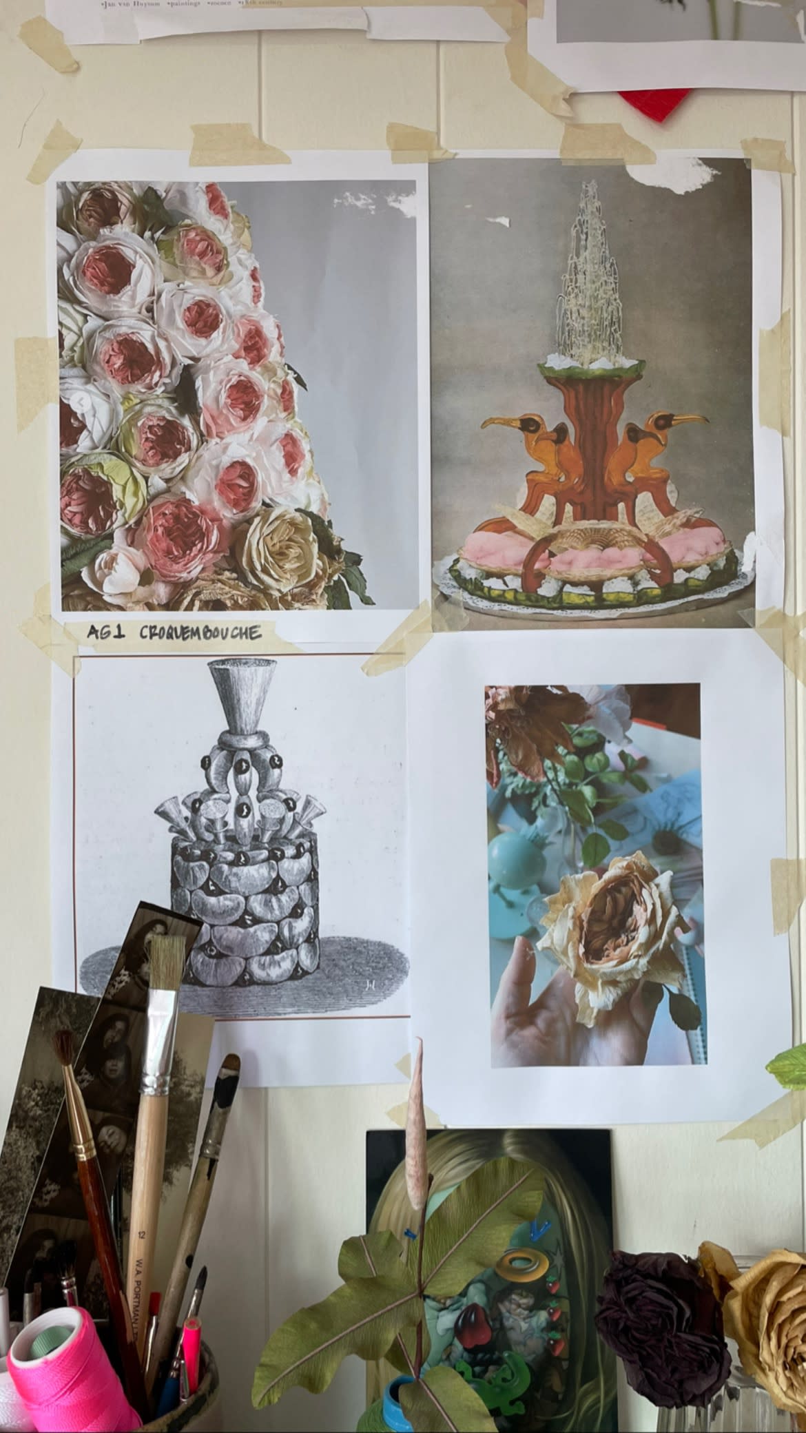 Tiffanie TurnerCroquembouche, 2022Italian crepe paper, stain, glue, floral wire, chalk, chicken egg shells, hat stand, metal platter on pedestal, epoxy adhesive26 1/2 x 15 in